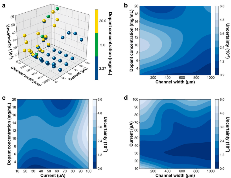 基于机器学习SVR模型预测的器件不确定度与掺杂浓度、电流、沟道宽度之间的关系图