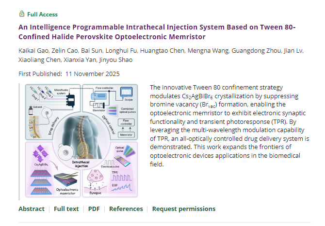 通过精确控制Tween 80封闭程度,研究团队制备了大晶粒尺寸、无针孔、高结晶度、超高光致发光强度的Cs2AgBiBr6薄膜。为了评估其在光电子器件中的性能表现,研究团队通过垂直堆叠工艺制备了钙钛矿基光电忆阻器,该忆阻器兼具电子突触功能(ESF)和瞬态光响应(TPR)特性。利用电刺激下的ESF在MNIST识别任务中达到了91%的识别准确率。在光刺激下,它展示出20 ms响应时间的TPR、931.7 s的超长耐久性,以及在5 Hz下超10次循环定性。在应用方面,所制备光电忆阻器通过多波长光脉冲编程实现了全光控写入和擦除,能够完成复杂的全光控图像处理任务。此外,作者们特别展示了一种基于光电忆阻器的全光控鞘内药物注射系统,最高可支持六种特定的药物释放策略。该工作为调控钙钛矿成核提供了可参考的封闭工艺和理论支持,也展示了光电忆阻器在全光控鞘内药物注射系统中的应用前景。