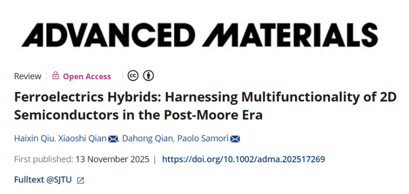 11月13日,上海交大机械与动力工程学院钱小石教授团队、生物医学工程学院钱大宏教授团队与法国斯特拉斯堡大学纳米化学实验室等研究团队合作,在国际期刊Advanced Materials上发表综述论文“Ferroelectric Hybrids Harnessing Multifunctionality of 2D Semiconductors in the Post-Moore Era”,对铁电材料、二维半导体及功能分子在后摩尔时代电子器件中的融合发展进行了系统性总结与前瞻性展望。这是该领域首篇系统探讨“铁电—二维—分子”三元杂化体系在逻辑、存储及类脑计算等多功能电子学中协同机理与应用前景的综述性成果。博士后邱海欣为论文第一作者,钱小石教授和法国斯特拉斯堡大学Paolo Samorì教授为共同通讯作者。