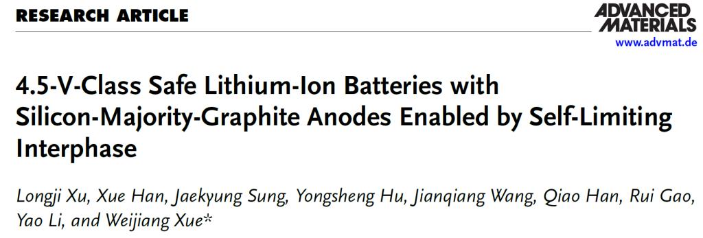 以上工作成果以《自限性界面赋能4.5 V级高硅负极高安全锂离子电池》(“4.5-V-class safe lithium-ion batteries with silicon-majority-graphite anodes enabled by self-limiting interphase”)为题,发表于国际权威杂志《先进材料》(Advanced Materials)。西安交通大学金属材料强度全国重点实验室为论文第一通讯单位,本论文由西安交通大学材料科学与工程学院博士一年级研究生徐龙基担任第一作者,材料学院薛伟江教授为通讯作者。该工作还得到了能动学院王建强博士和高瑞老师、上海交通大学韩雪博士、李尧老师的大力支持。该工作得到国家自然科学基金的资助,和西安交通大学材料学院微纳中心和分析测试中心的鼎力支持。