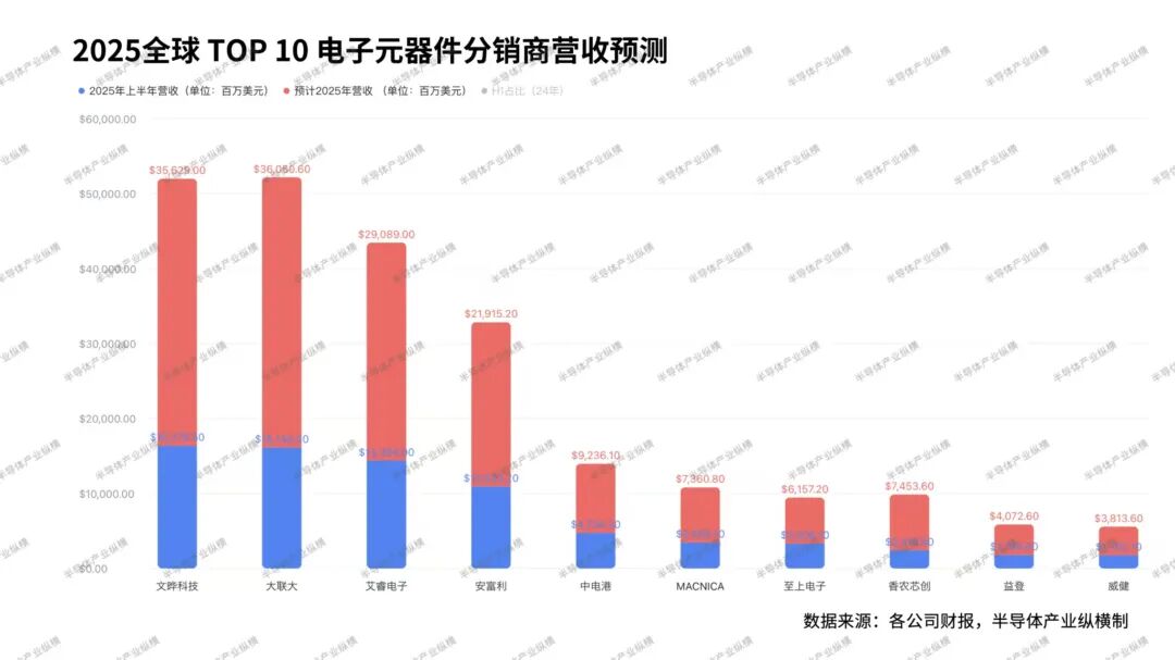 半导体产业纵横预测2025年全球前十分销商总销售额有望超过1608亿美元;根据2024年营收数据,全球元器件分销商的营收总和在1599亿美元左右,增长幅度约为1%。