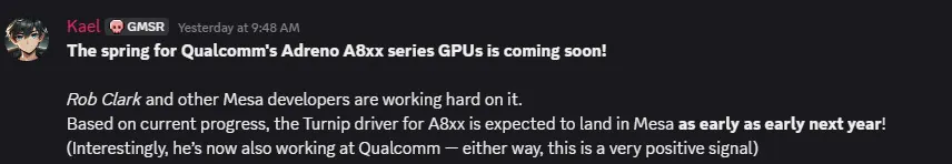 根据 Mesa GitLab 开发者页面及 GameHub Discord 频道披露的信息,一款全新的开源 Turnip 驱动正在开发中,最早将于 2026 年初与用户见面。高通员工兼开发者 Rob Clark 确认,该驱动将明确支持第五代骁龙 8 至尊版的 Adreno 840 GPU,并将兼容骁龙 8 至尊版的 Adreno 830 GPU。