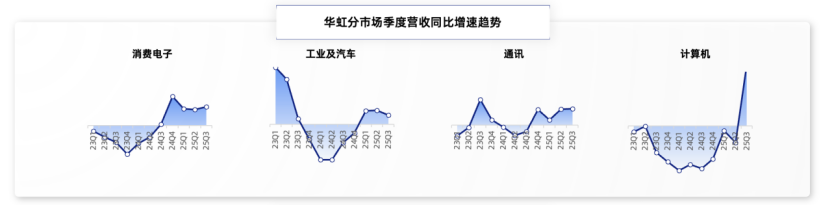 华虹公司业务在消费电子、工业及汽车、通讯、计算机四大领域的表现各具特色。