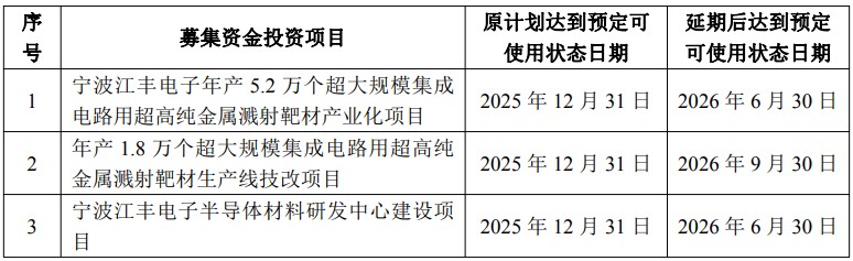 公告显示,本次延期涉及三个募投项目,原计划均于2025年12月31日达到预定可使用状态,延期后时间分别调整至2026年6月30日及9月30日。