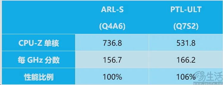 我们将这颗Panther Lake-ULT处理器的单核跑分,与此前的Arrow Lake-S处理器进行量化对比就会发现,尽管前者有着功耗上更大的限制、所搭配的内存延迟也高许多,但新的Cougar Cove大核还是在低压笔记本平台表现出了比目前英特尔最新台式机处理器高出大约6%的P核同频性能。