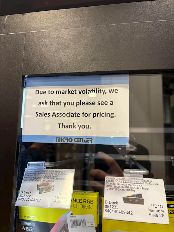 一位美国网友还发现,至少一家Micro Center商店内,内存产品的价格标签已经被去掉了,取而代之的是一个大大的告示: