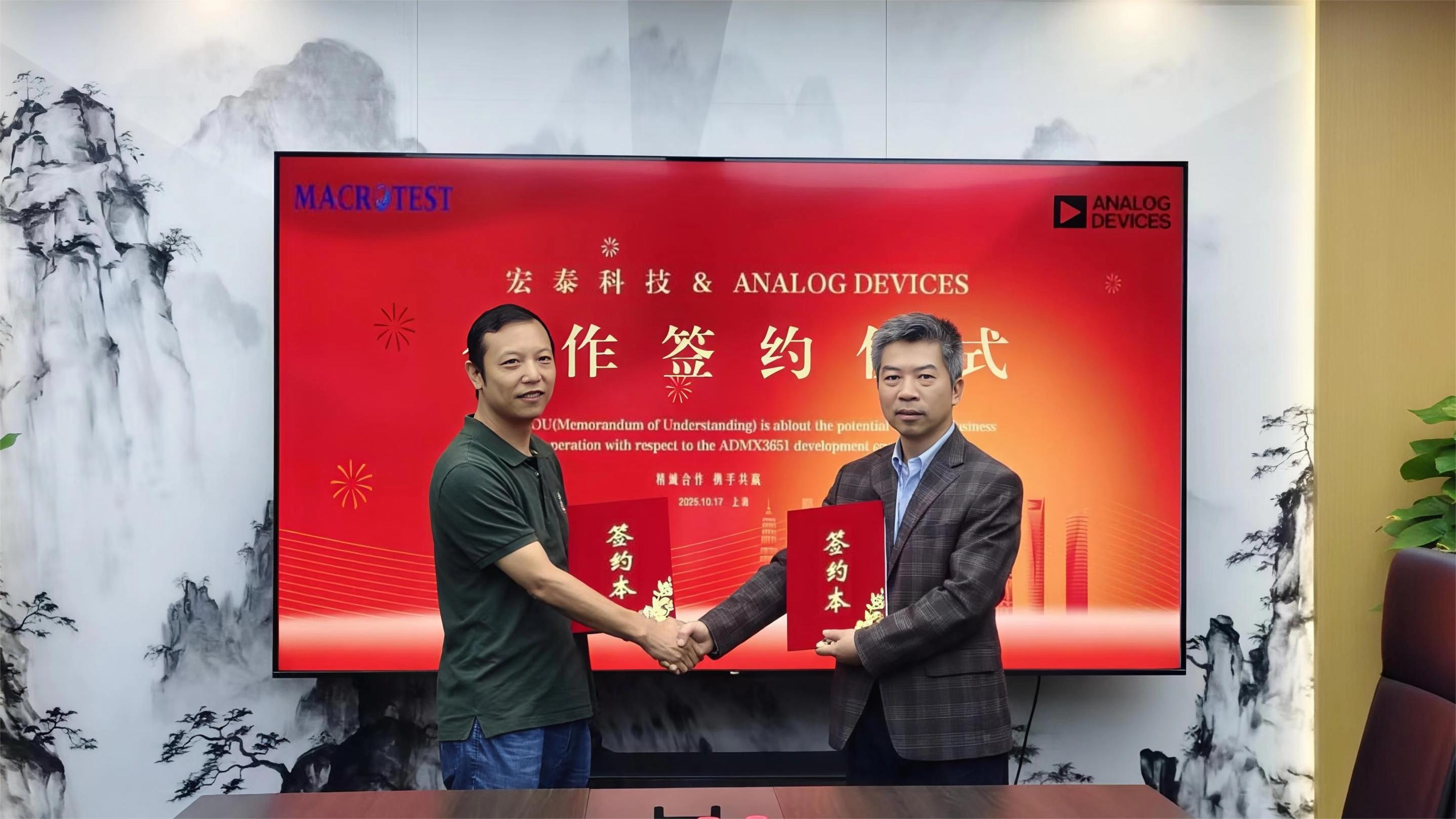 近日,南京宏泰半导体科技股份有限公司(以下简称“宏泰科技”)与全球领先的高性能半导体公司ADI正式签署合作备忘录,双方将在半导体测试与精密信号测量领域展开持续深度合作,共同推动高性能测试系统的技术创新与市场应用落地。