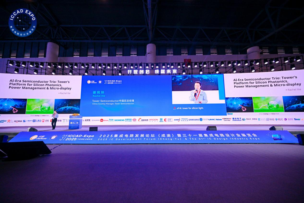 11月20日,以“成渝同芯,同屏共振”为主题的成渝集成电路2025年度发展论坛暨第三十一届集成电路设计业展览会(ICCAD-Expo 2025)在成都西博城隆重开幕,TowerSemiconductor中国区总经理谢宛玲在高峰论坛上发表了以《AI时代的半导体工艺三重奏:Tower面向智能计算的硅光、微显示和电源管理》为主题的演讲,阐述了在AI时代来临的背景下,Tower在硅光、微显示和电源管理领域的布局。