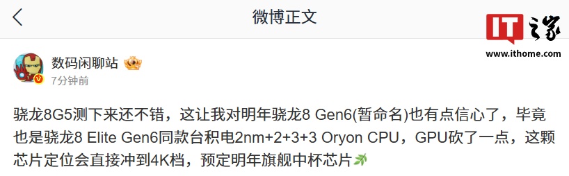 IT之家 11 月 27 日消息,博主 @数码闲聊站 今日发文透露,骁龙 8 Gen6(暂命名)处理器将采用骁龙 8 Elite Gen6(第六代骁龙 8 至尊版)同款台积电 2nm+2+3+3 Oryon CPU,GPU 砍了一点。