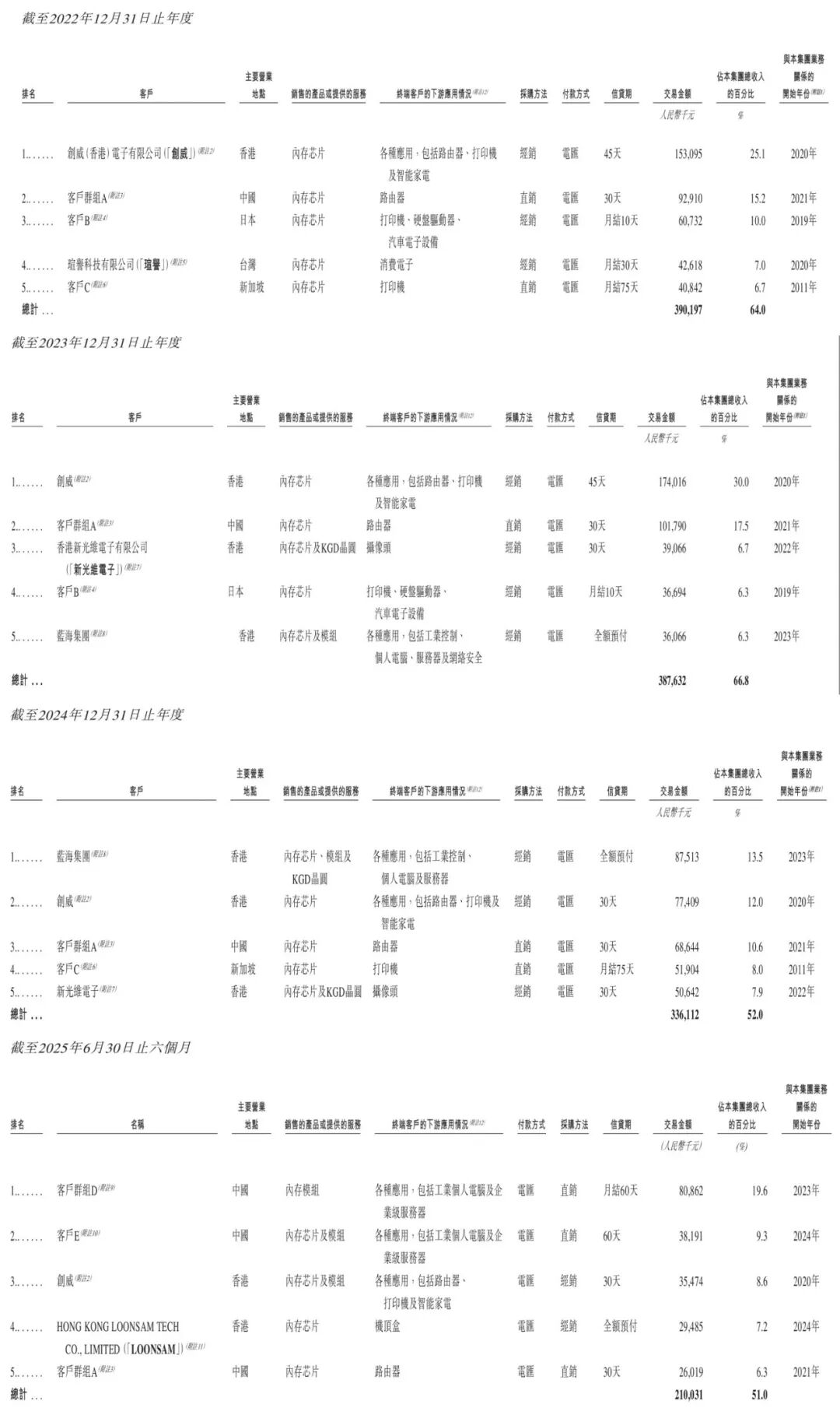 力积存储的客户主要分布于消费电子、网络通信、汽车电子、能源及工业控制设备等行业。在截至2024年12月31日的三个年度及截至2025年6月30日的6个月内,其来自前五大客户的收入分别约为人民币3.90亿元、3.88亿元、3.36亿元及2.10亿元,分别占各期间总收入的约64.0%、66.8%、52.0%及51.0%。