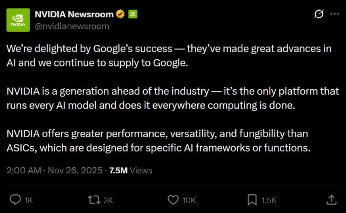 英伟达则首次呈现出明显的防御姿态,其财务团队甚至罕见地发布长文回应“循环经济融资”质疑,可见谷歌的动作已经触及英伟达的核心神经。