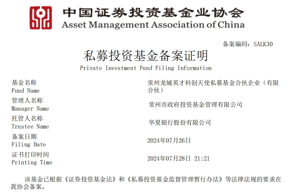 据龙城科创基金消息,常州龙城英才科创天使私募基金合伙企业(有限合伙)完成中基协私募投资基金备案,并成功投资迪盛(武汉)微电子科技有限公司,标志着该基金首个直投项目正式落地。