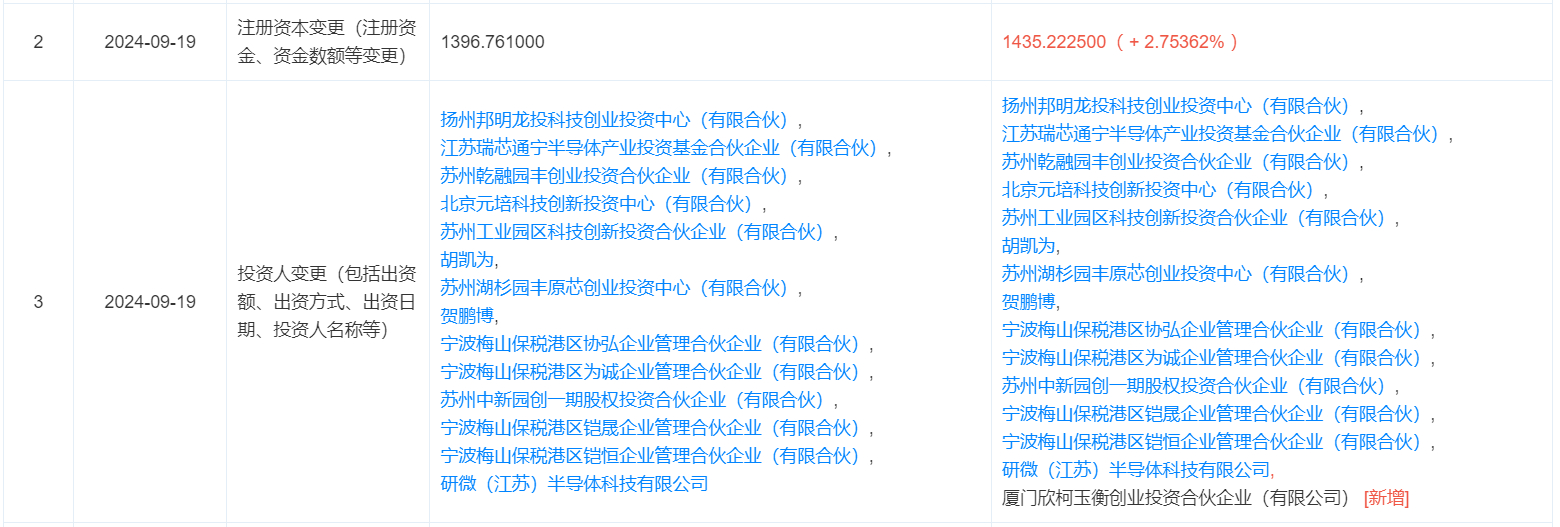 天眼查消息显示,苏州铠欣半导体科技有限公司(以下简称“铠欣半导体”)9月19日新增厦门欣柯玉衡创业投资合伙企业(有限公司)等股东,同时注册资本增加至1435.22万元,增幅达2.75% 。