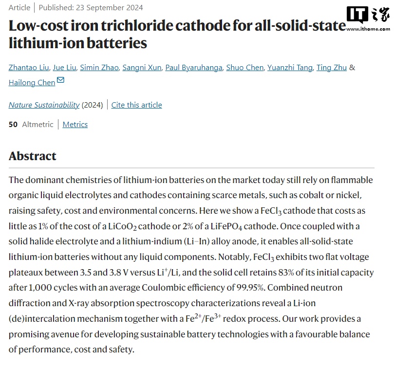 IT之家 9 月 25 日消息,美国佐治亚理工学院陈海龙领导的研究团队开发出了一种用于锂离子电池的低成本“氯化铁”阴极材料,这项成果将极大地改善电动汽车市场以及整个锂离子电池市场。