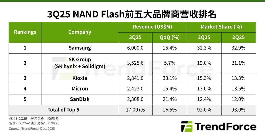 从整体市场来看,今年上半年各大 NAND 原厂的减产策略对供需平衡的调节效果开始显现,AI 基础设施建设热度持续推动企业级固态硬盘需求走旺,是 2025Q3 各大原厂 ASP(平均单价)和营收同步走高的关键原因。