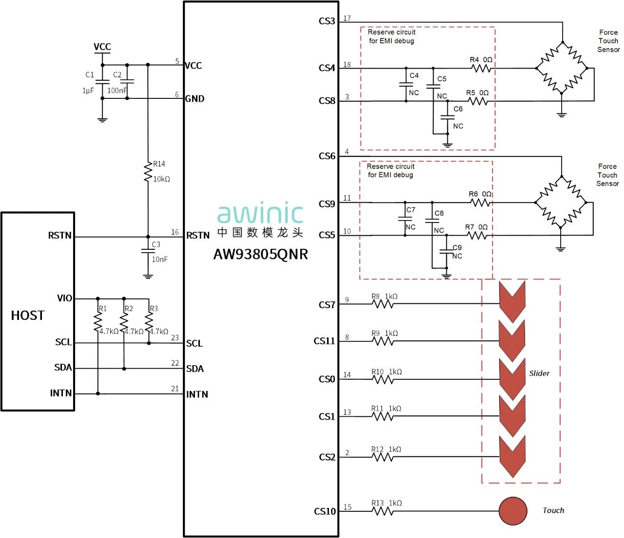 产品应用面临需要同时使用force和cap应用场景时,往往会采用多个独立芯片完成不同功能,或针对单一功能需要协同工作实现,集成式芯片封装优势可以减少占板面积。例如AW93804QFN和AW93310QFN对比在封装一样的前提下迭代增加了电阻式压感模组的检测应用。