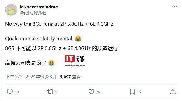 消息源 @reikaNVMe 曝料称高通骁龙 8 Gen 5 将沿用 2+6 CPU 集群设计,但 2 个性能核心的时钟频率达到 5.0 GHz,而 6 个能效核心的频率达到 4.0 GHz。