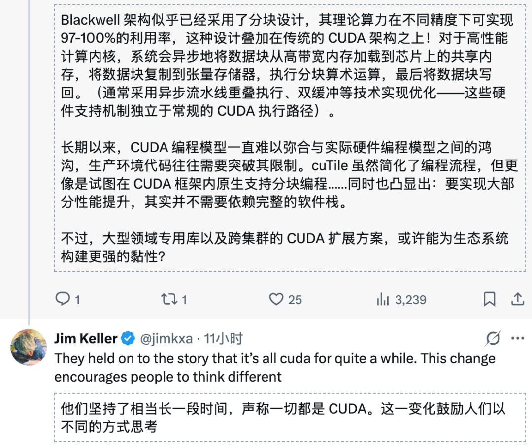 他的理由是当英伟达的GPU也转向Tile瓦片结构,而其他硬件厂商一样转向瓦片架构,AI内核将更容易移植。