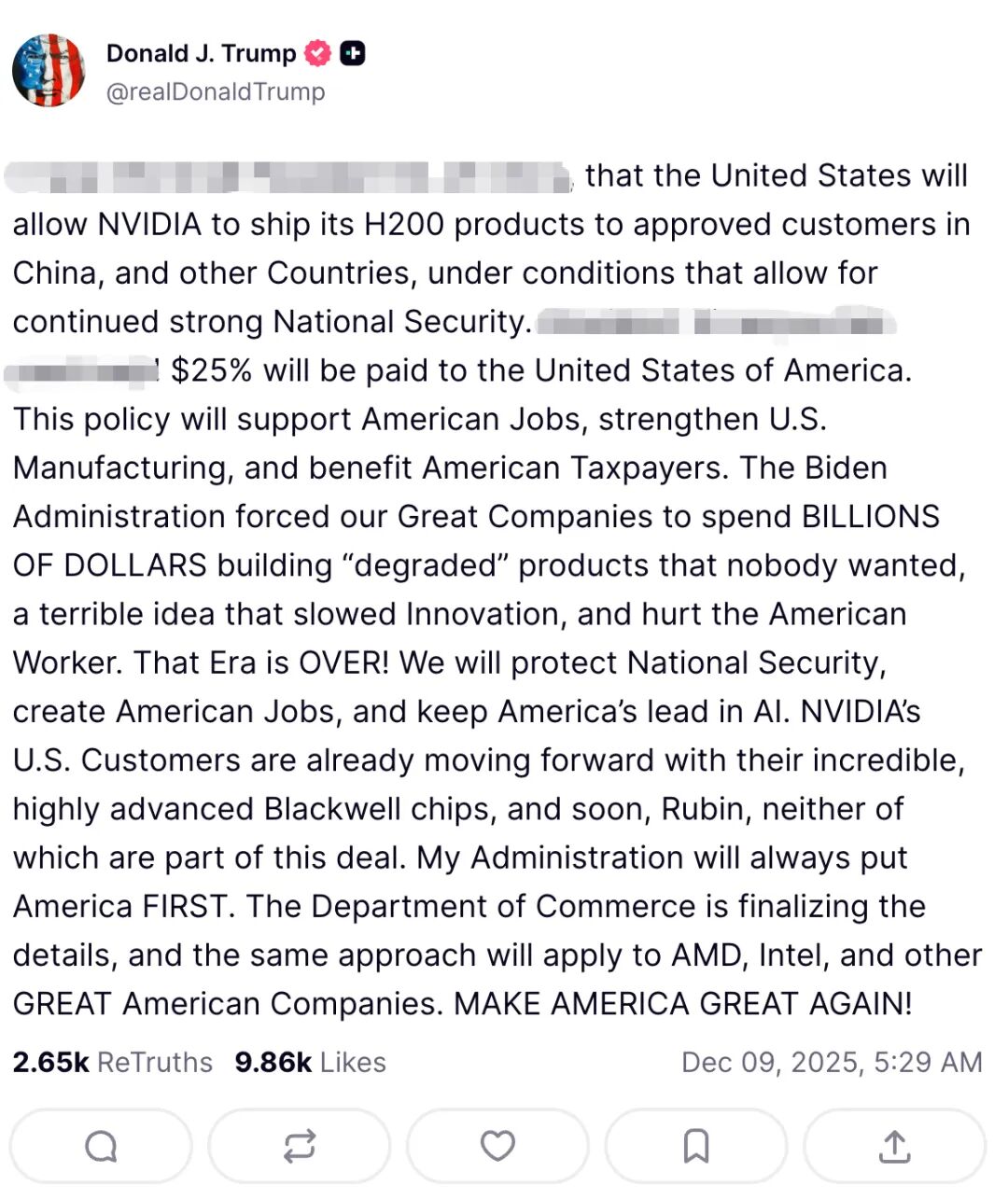 美国东部时间12月9日凌晨,美国总统特朗普在其个人创办的社交媒体Truth Social(真相社交)上发布消息表示,美国将允许英伟达公司向中国及其他国家的合格客户交付H200产品,前提是确保美国国家安全得到保障。