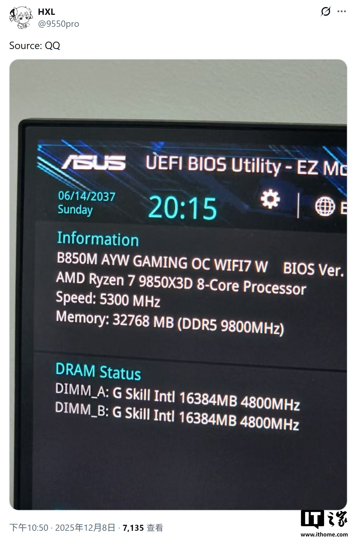 IT之家 12 月 9 日消息,消息源 @9550pro 昨日(12 月 8 日)在 X 平台发布推文,分享了一张截图,首次展示了 AMD Ryzen 7 9850X3D 处理器在华硕 B850M AYW Gaming WIFI7 W 主板上的运行实况。