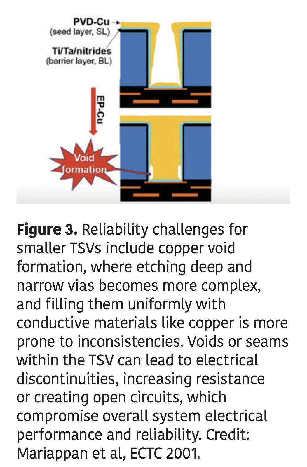 目前,传统TSV(直径通常为5-10μm,深度为50-100μm)正向下一代TSV(直径可达50μm,深度可达300μm)过渡。小型TSV非常适合低频、低功耗应用,例如移动通信和DRAM集成,但却难以满足人工智能和高性能计算(HPC)等应用对电流、散热和带宽的高要求。其较小的尺寸限制了其可处理的电流,导致电阻损耗增加,从而降低信号完整性,尤其是在高频工作条件下。此外,这些小型TSV的散热能力有限,对热敏元件构成重大挑战。