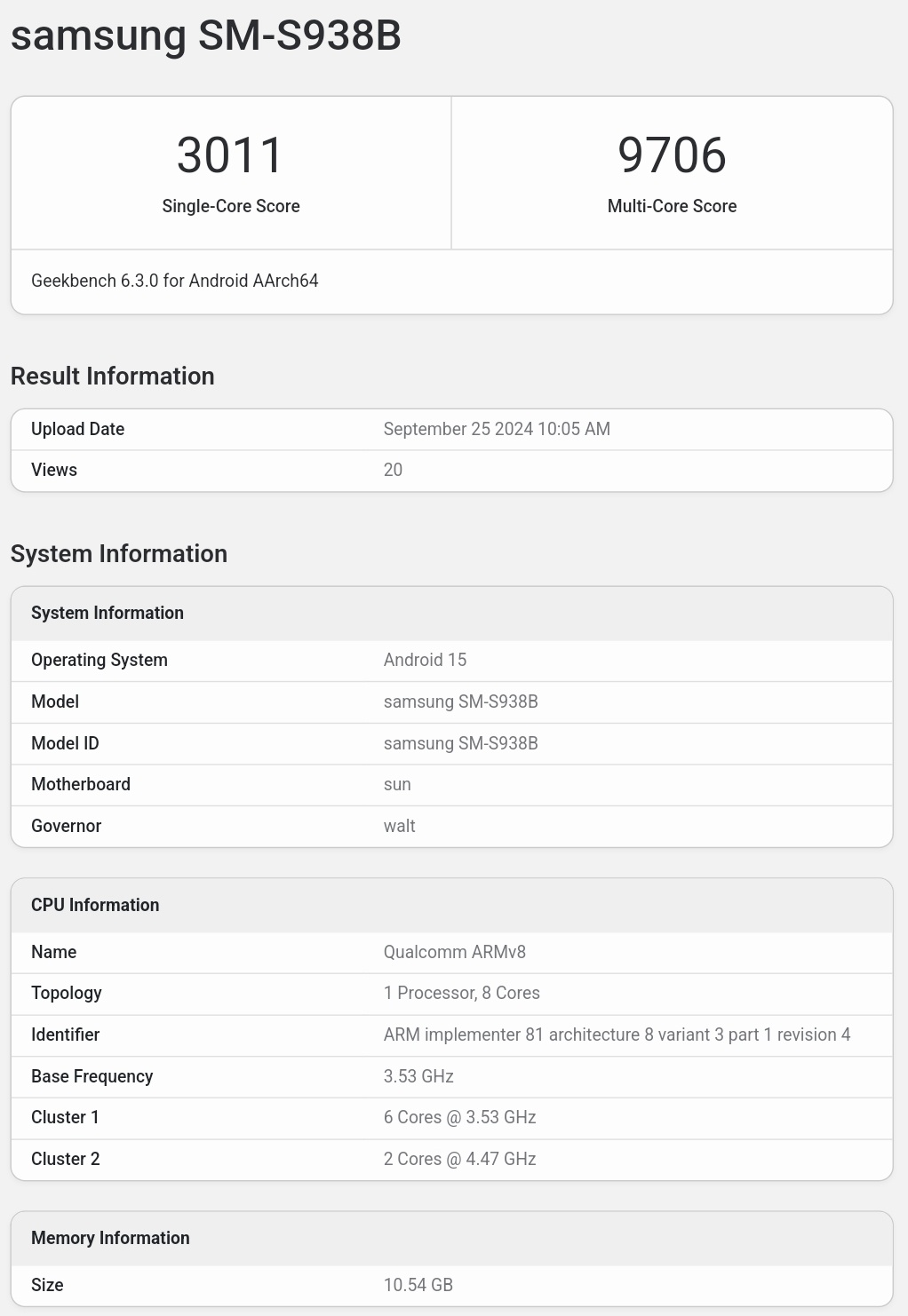 IT之家 9 月 25 日消息,高通骁龙 8 Gen 4 for Galaxy(又称骁龙 8 Gen 4 领先版)的 Geekbench 跑分已经流出,IT之家注意到,该处理器的大核频率提升至 4.47GHz,单核跑分为 3011 分,多核跑分为 9706 分,该处理器应该会搭载于三星 Galaxy S25 系列手机。