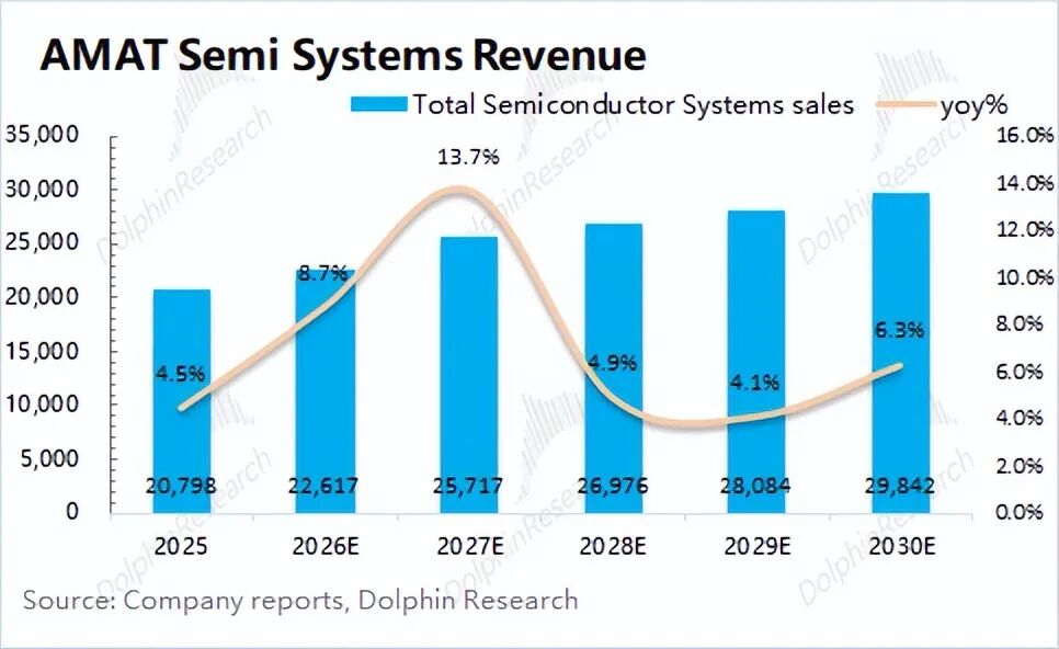 综合来看,预期应用材料AMAT的收入端有望从283亿美元成长至400亿美元,复合增长率约为7%左右。