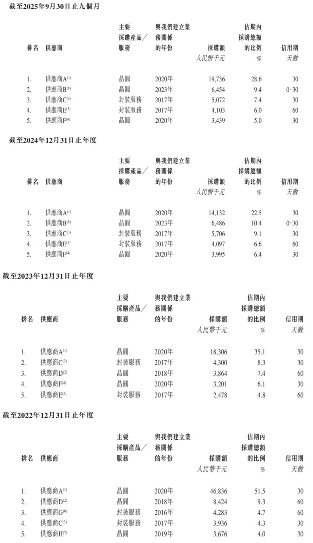 同期,该公司向单一最大供应商的采购额分别约为人民币4680万元、1830万元、1410万元及1970万元,分别约占总采购额的51.5%、35.1%、22.5%及28.6%。