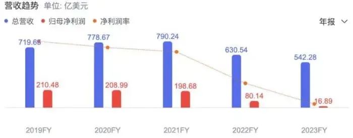 英特尔的颓势自2021年开始显现。当年该公司全年营收接近800亿美元,随后以每年下跌100亿美元的速度断崖式下滑。2023年,英特尔全年收入跌破600亿美元,营收锐减三分之一。