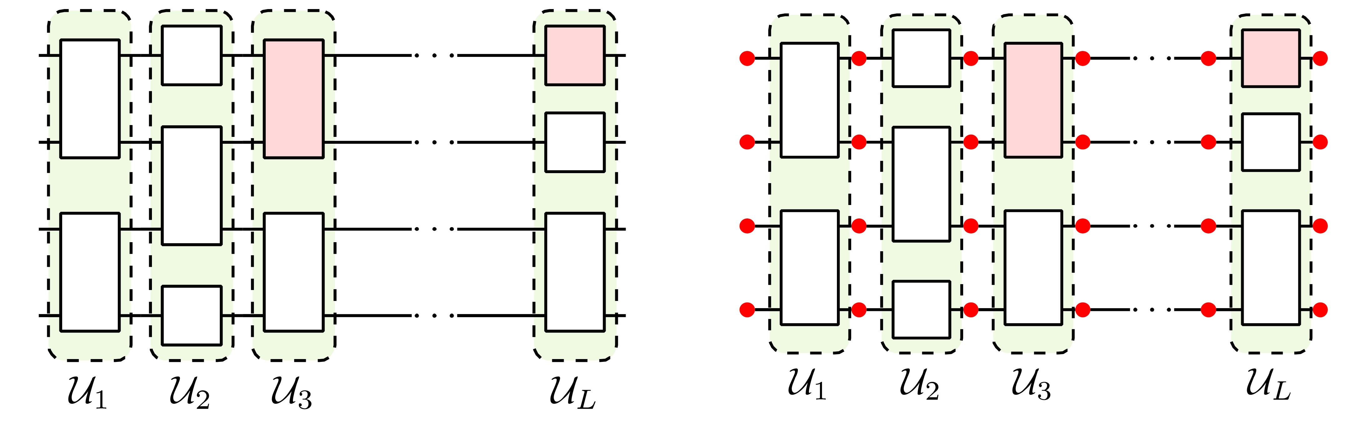 该工作考察了由Clifford门与任意比特单参数Pauli旋转门共同组成的量子线路(上图分别对应白色和粉色方块表示),囊括了当前大部分变分量子算法的线路架构。同时考虑线路中存在独立的单比特Pauli型噪声通道,这一噪声模型包括了实验中最常见的去极化噪声(depolarizing)和退相位噪声(dephasing)等。研究团队认为,同样的方法也可以很容易地推广至更普遍的单比特噪声,比如保单位噪声(unital noise)。