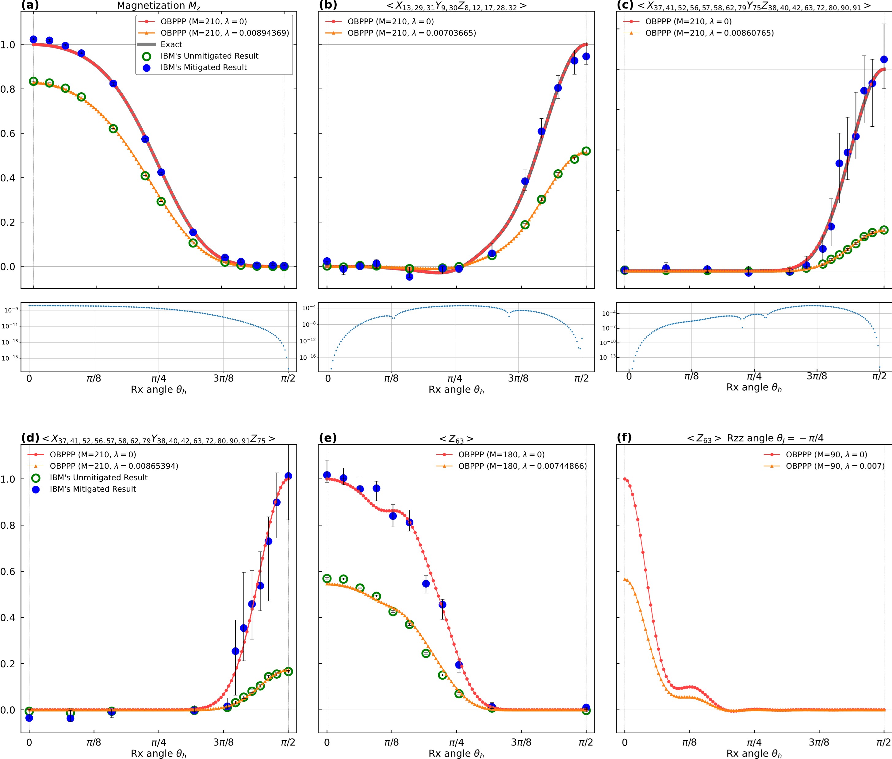 研究人员成功地对IBM的Eagle量子处理器的算法进行了经典模拟,运行时间比量子硬件更短,同时实现了更准确的期望值。以模拟IBM算法实验为例,量子比特数为127,线路深度为80,OBPPP得到每张图的计算时间均小于5分钟(基于2张Xeon6330 CPU的结果)。此外,对不同的噪声率,根据路径压制因子,从而很容易地推出对应算符期望值,与未修正的原始实验数据直接对比,表现出与实验结果很强的一致性。