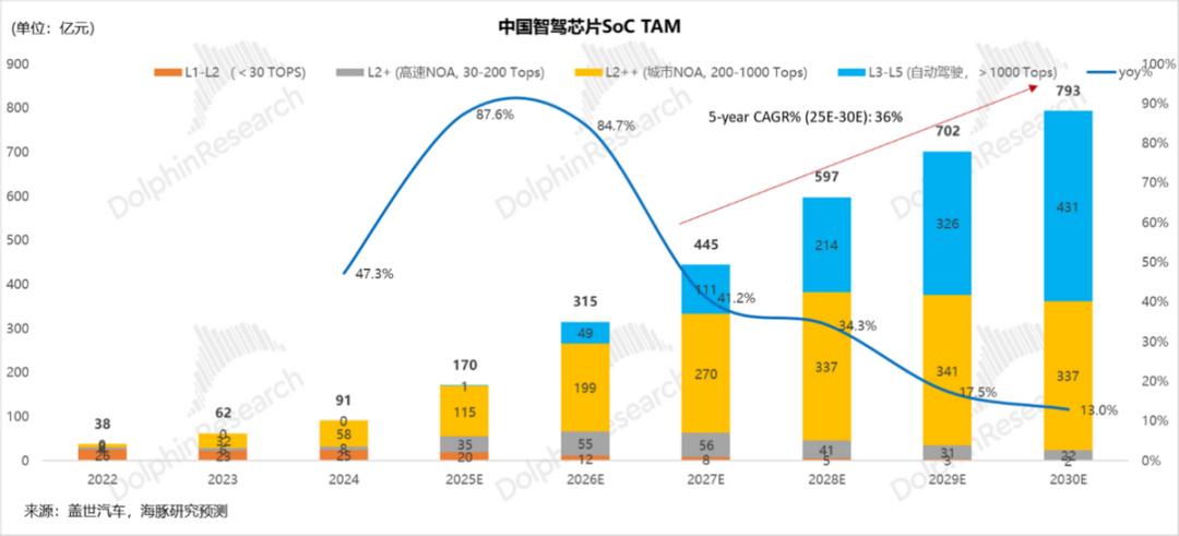 海豚君估计,这个趋势也会一直延续:智驾SOC市场规模2025—2030年CAGR为 38%。但未来L2++及以上的大芯片算力市场(200 TOPS及以上)会结构性高增(5年高达 46%,且占总芯片市场空间比例达到78%),挤压L1-L2 (小算力芯片)和L2+(中算力芯片) 的市场(5年CAGR分别为-35%和-9%)。