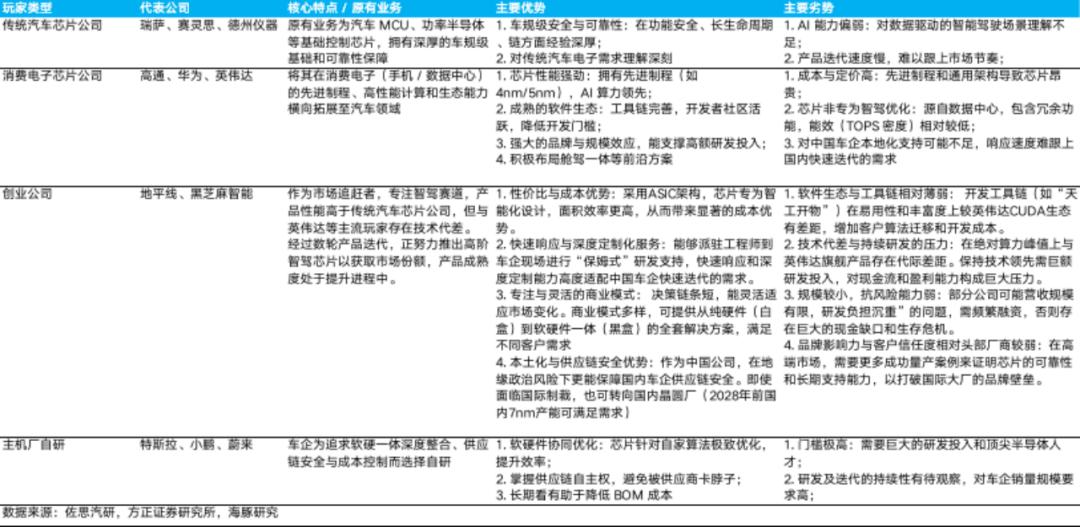 ④ 主机厂自研:特斯拉、小鹏汽车、蔚来汽车等。主机厂追求软硬一体化深度整合,掌握供应链自主权以及降低BOM成本,同时可将智驾芯片扩展至具身智能上。但自研芯片门槛高,对车企的销量规模,人才储备和资金投入要求都很苛刻,不是谁都能做。