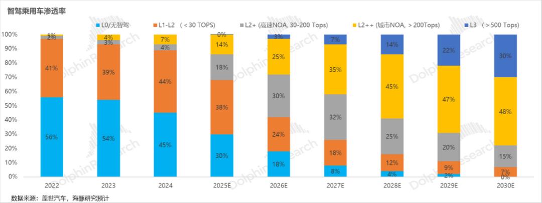 海豚君预计单车芯片价值将在2030年增长至近3000元,主要由大算力芯片占比的提升所带动 (200 TOPS以上芯片占比达到78%)。