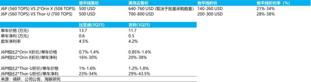 这有助于比亚迪和吉利这种规模大、低毛利的车企,采用地平线J6P芯片能加速城市NOA在平价车型上的渗透。