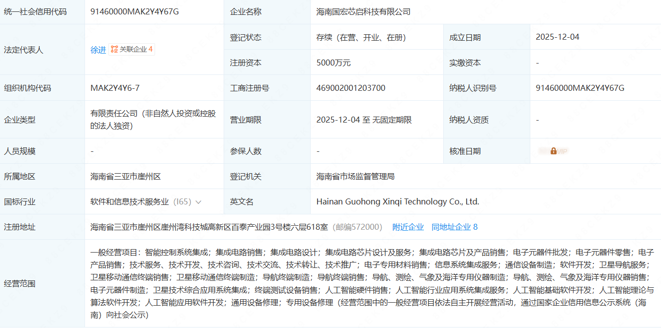 据企查查APP披露,海南国宏芯启科技有限公司的经营范围包括集成电路设计、集成电路芯片设计及服务等。业务同时覆盖人工智能硬件销售、人工智能行业应用系统集成服务以及人工智能基础软件开发。从公开信息看,新公司有望承接芯片设计与AI应用相关项目,增强公司在相关细分市场的承接与服务能力。