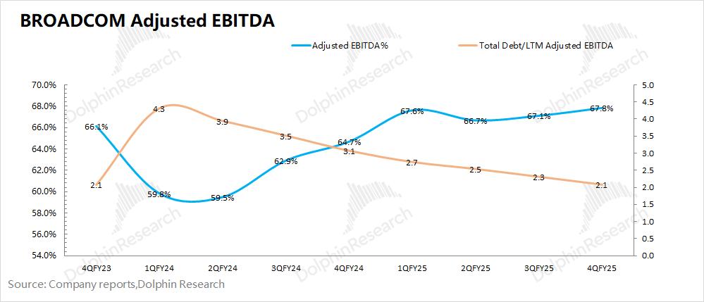 由于博通擅长外延并购,公司通常把调整后EBITDA%作为公司的经营面指标之一。而海豚君测算公司2025财年第四季度的调整后EBITDA%回升至67.8%,好于公司此前指引(67%)。