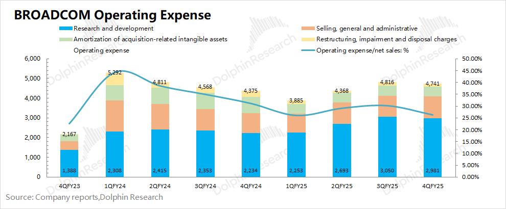 博通BROADCOM (AVGO.O)在2025财年第四季度的经营费用为47.4亿美元,环比略有回落。