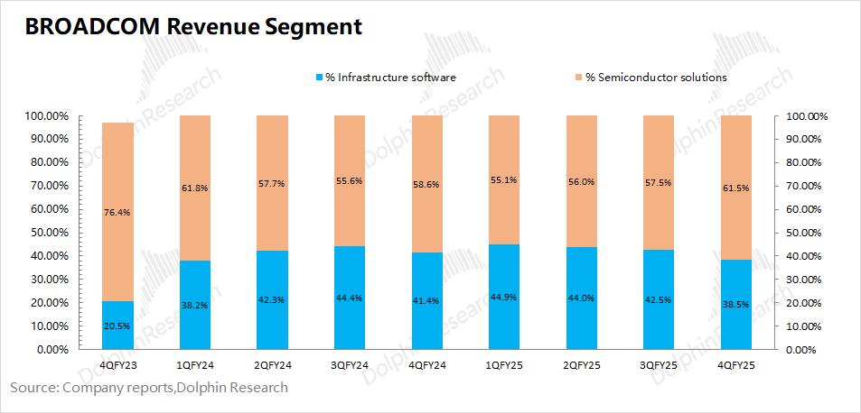 博通BROADCOM (AVGO.O)在2025财年第四季度的基础设施软件实现营收69.4亿美元,同比增长19%。增长主要来自于VMware的并购整合和收费模式调整(从永久许可证模式全面转向于订阅模式)。