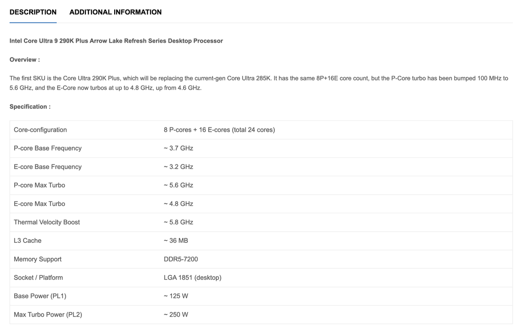 尽管如此,酷睿Ultra 7 270K Plus和酷睿Ultra 9 290K Plus的商品页面还是列出了CPU规格,这些规格与我们迄今为止所看到的泄露信息高度吻合。或许,这又是一个迹象,表明这些信息可能是从网上已有的资料中整理出来的,而非直接来自英特尔或官方渠道。此外,这两款产品的商品页面均未标明价格,而是标注了“询价”。