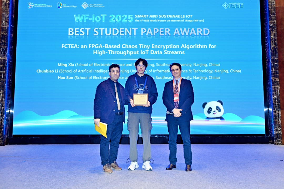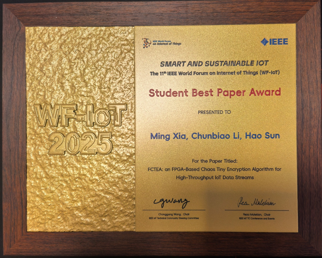 第十一届IEEE World Forum on Internet of Things (WF-IoT)国际会议于10月27日至10月30日在成都召开,东南大学电子科学与工程学院的科研团队凭借其在物联网数据安全领域的创新研究,荣获大会颁发的“最佳学生论文奖”(BEST STUDENT PAPER AWARD)。获奖论文题为“FCTEA: an FPGA-Based Chaos Tiny Encryption Algorithm for High-Throughput IoT Data Streams”。