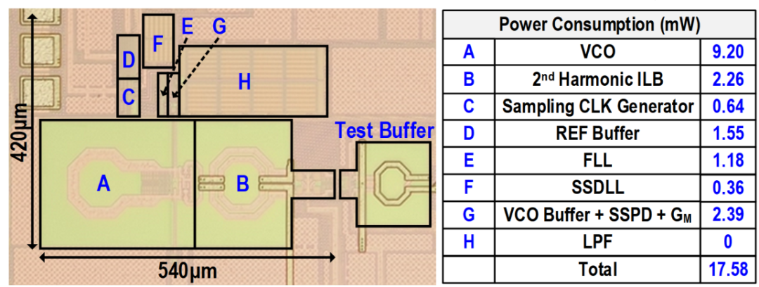 基于这些前沿技术,团队采用 65nm CMOS 工艺成功研制了一款 K 波段锁相环时钟芯片,输出频率覆盖 22.4–25.6 GHz,整体功耗仅为 18 mW,RMS 积分抖动优于 50 fs,抖动-功耗优值(FoM)达到 −254 dB 以下,处于国际领先水平。