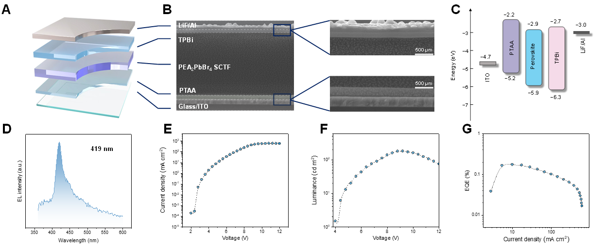 研究成果以“基于钙钛矿单晶薄膜的深蓝光发光器件”(Deep-blue light-emitting diodes based on perovskite single-crystal thin films)为题,于12月10日发表于《科学·进展》(Science Advances)。