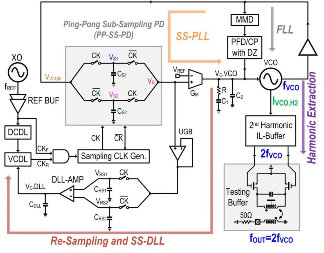 针对这些关键技术难题,中国科学院微电子研究所抗辐照器件技术重点实验室杨尊松、黄云波团队联合清华大学,开创性地提出了双边沿乒乓亚采样锁相环架构。该创新设计巧妙利用参考时钟的上升沿与下降沿,实现参考频率的等效倍频,成功解决了传统亚采样锁相环在环路带宽、带内相位噪声与参考杂散之间的设计矛盾。研究团队还开发了一种高效率的注入锁定缓冲器方案,该方案在高效提取振荡器二次谐波的同时实现谐波整形,显著降低了锁相环的带外相位噪声。