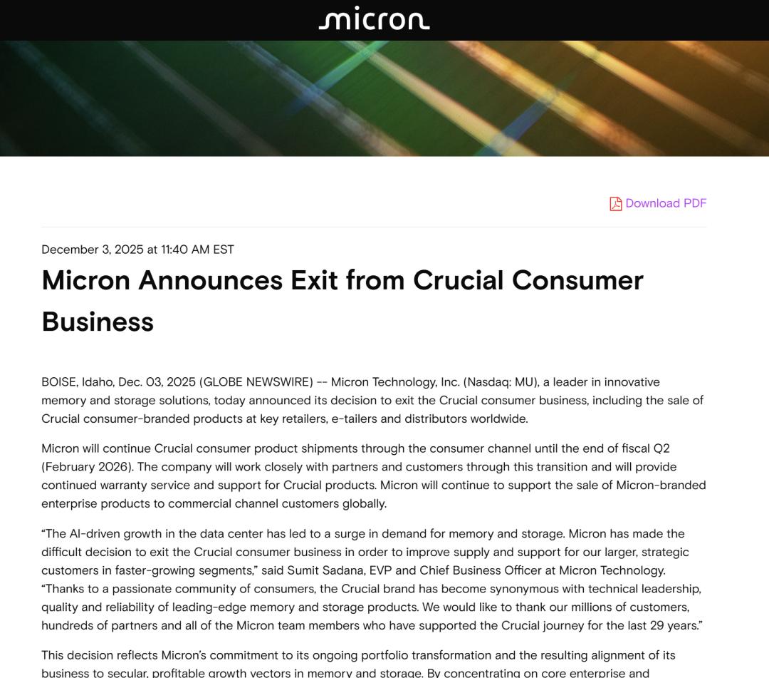 最近,更加雪上加霜的消息来了:当地时间 12 月 3 日,镁光科技公司宣布,决定推出消费级市场,终止 Crucial(英睿达)消费级业务,包括在全球主要零售商、电商平台和分销商处销售英睿达消费品牌产品。