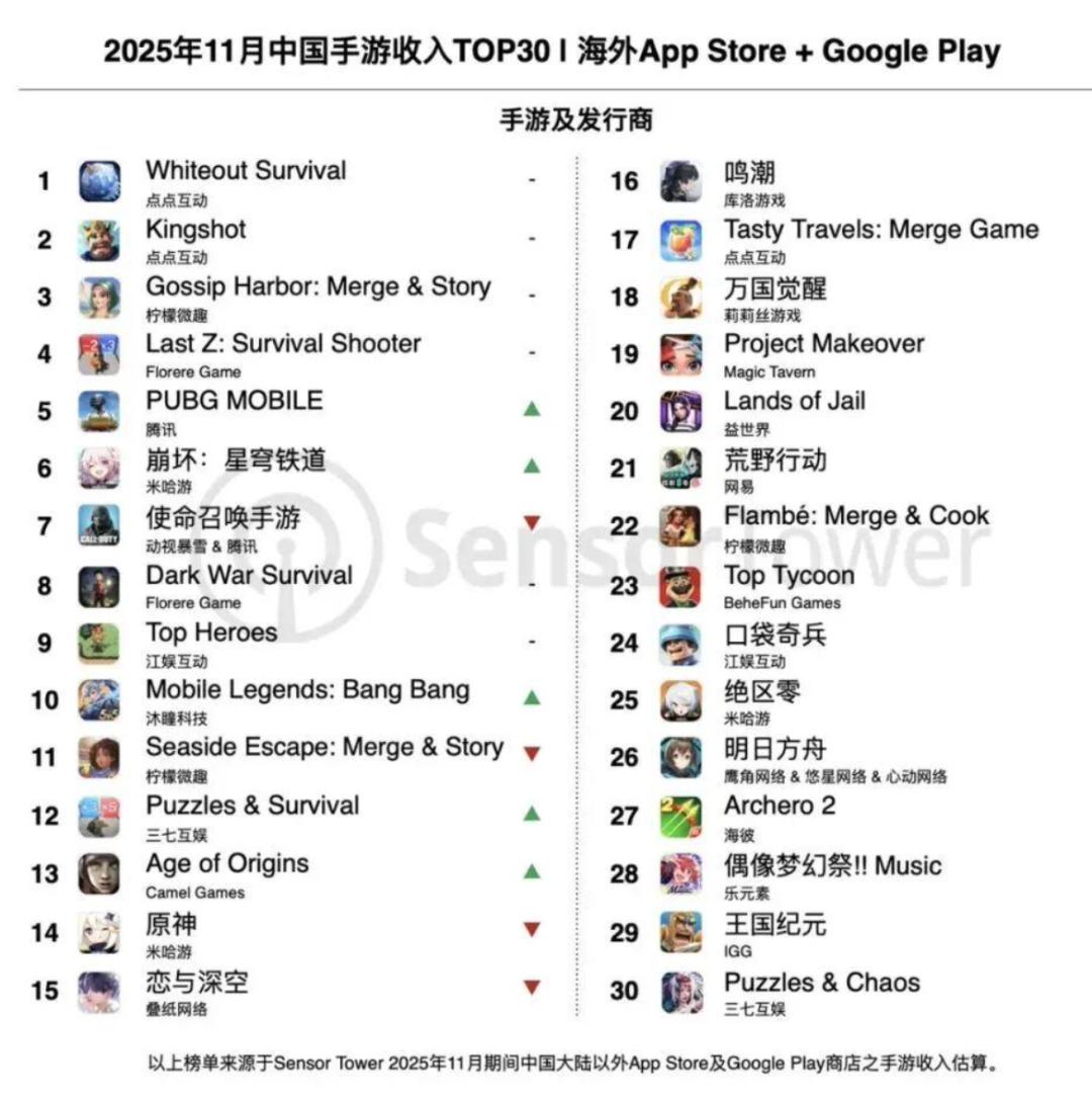 据Sensor Tower不久前发布的2025年11月中国手游产品在海外市场收入排行TOP30榜单,点点互动旗下两款主打游戏《Whiteout Survival》(无尽冬日)和《Kingshot》(奔奔王国)继续包揽收入榜冠亚军,再次证明了其在海外市场的强大吸引力。