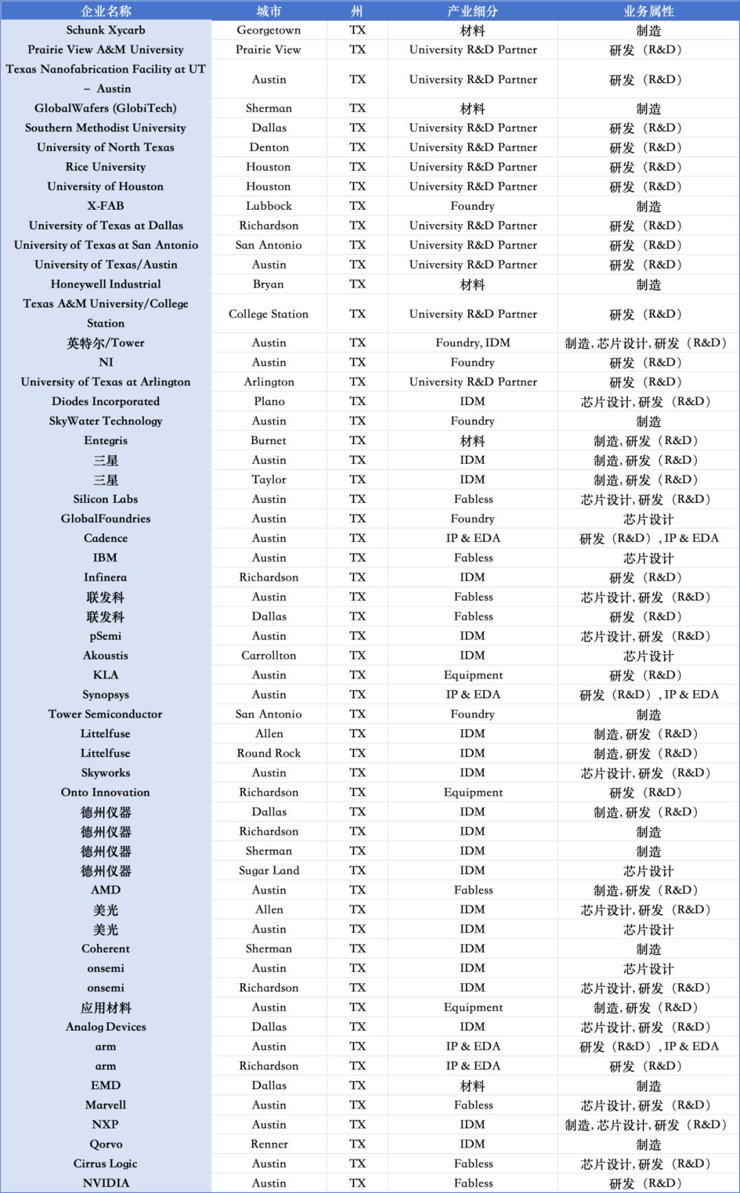核心力量包括:德州仪器(达拉斯 + Sherman + Richardson)、三星(Austin + Taylor)、恩智浦(Austin)、GlobalWafers(Sherman)、Applied Materials(Austin)。