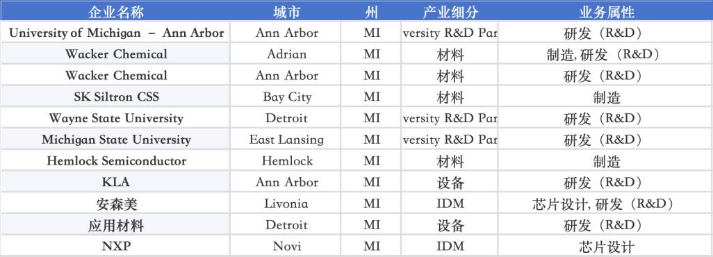 Michigan 则在汽车电子链条中扮演关键角色,KLA、Hemlock Semiconductor、SK Siltron CSS、NXP 与 Analog Devices 等企业叠加 Wayne State University、Michigan State University 与 University of Michigan,成为车规芯片、功率器件与材料体系的重要支点;