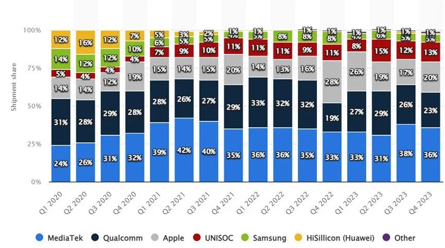 根据statista的数据,早在2020年三季度,高通的市场份额就开始低于联发科。到2022年四季度,高通的市场萎缩至19%,低于联发科的33%。2023年高通逐步收复失地,份额上升。到2023年四季度,仍只有23%,而联发科高达36%。