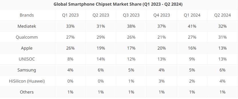 根据counterpoint的最新统计,2024年Q2,高通在全球手机市场的份额才恢复到31%,但仍落后于联发科的32%。